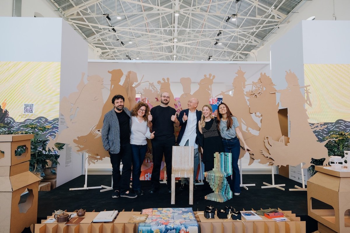 是货郎担和「八仙」,这些装置都由再生纸板制成。Davide 和我进行了一场 Cosplay。货郎和货郎担是古代中国风俗画中十分受欢迎的题材,货郎挑着货郎担一边叫卖一边走街串巷,这样的场景在欧洲也并不叫人陌生。在传统的货郎担里有日常必需品与潮流物品,像一个百宝箱。我们借用了这个百宝箱,不仅是搬运,更是在当代背景下创造新的物品,由两位东西方的「货郎」Davide 和我共同传递中国与意大利的设计故事。